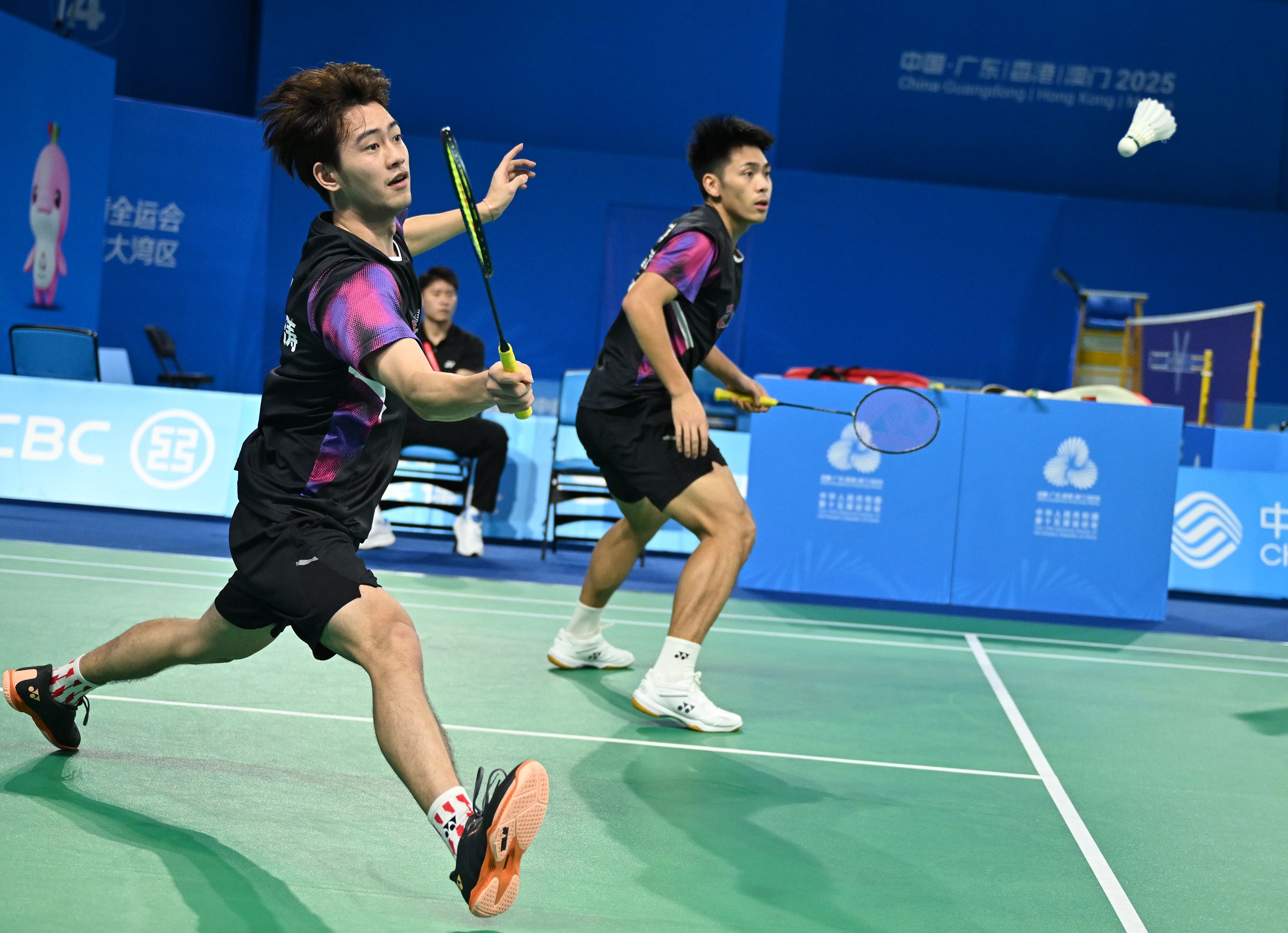 11月9日,广东队组合梁伟铿/任翔宇(左)在双打比赛中。新华社记者 李紫恒 摄